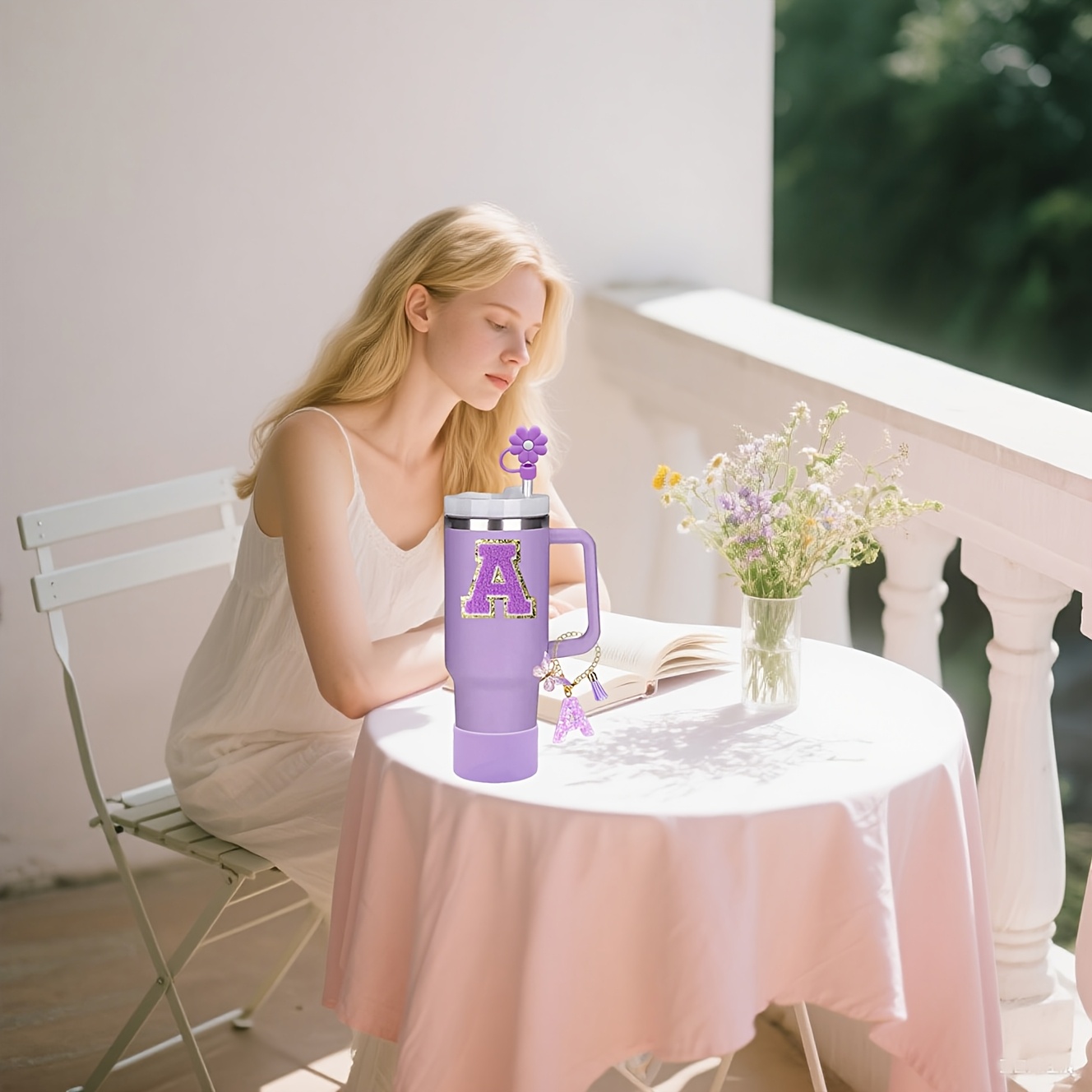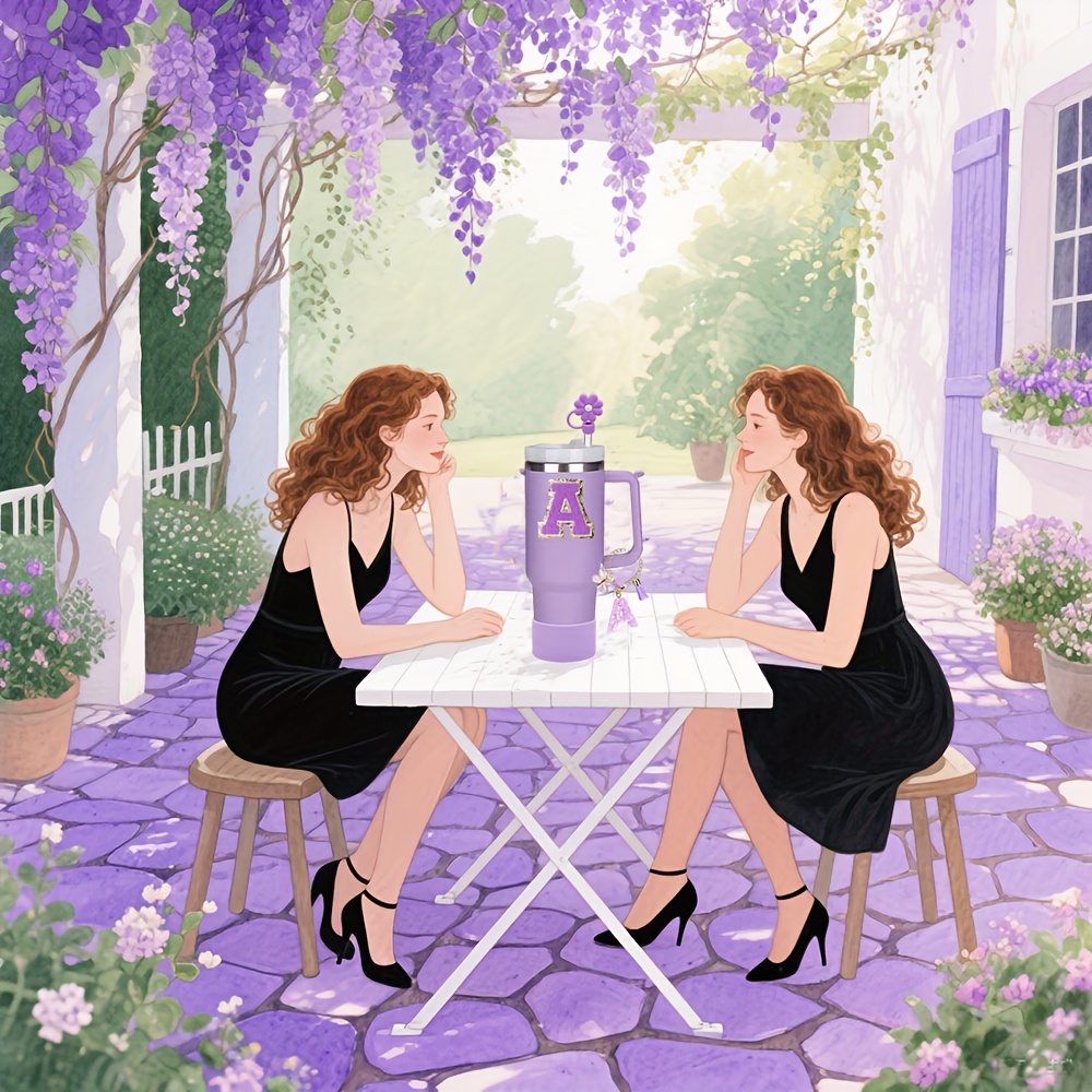 4pcs Purple Tumble Cup Accessories Set for 30oz 40oz Water Bottle Tumbler Cup Including Silicone Flower 10mm Straw Cover Cap, Initial Letter Sticker, Resin Letter Keychain Charm, Protective Boot for Cup Decoration