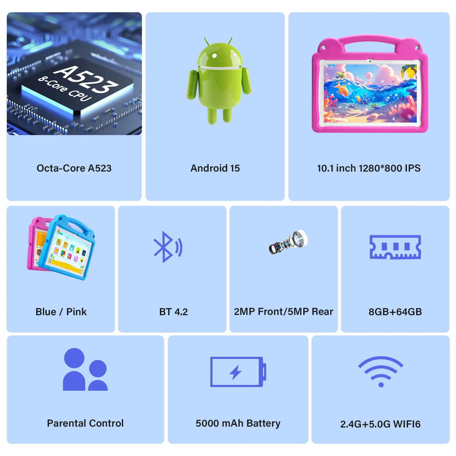 Our kids tablet comes with advanced Android 15, powerful 8 cores processor for smoother opening of apps and loading of pages.8GB RAM (4+4 Expandable), 64GB ROM, WIFI, Bluetooth, 5MP Rear + 2MP Front Camera, 5,000 mAh battery ensures hours of use. hours of use. The fully upgraded tablet is ideal for children.