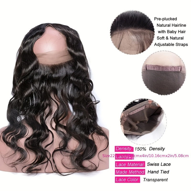 Fermeture frontale 360° Body Wave HD en dentelle avec frange - 100 % cheveux humains vierges Remy, densité 150 %, 40,64 cm, aspect naturel pour femme, postiche polyvalente, élégante et de haute qualité