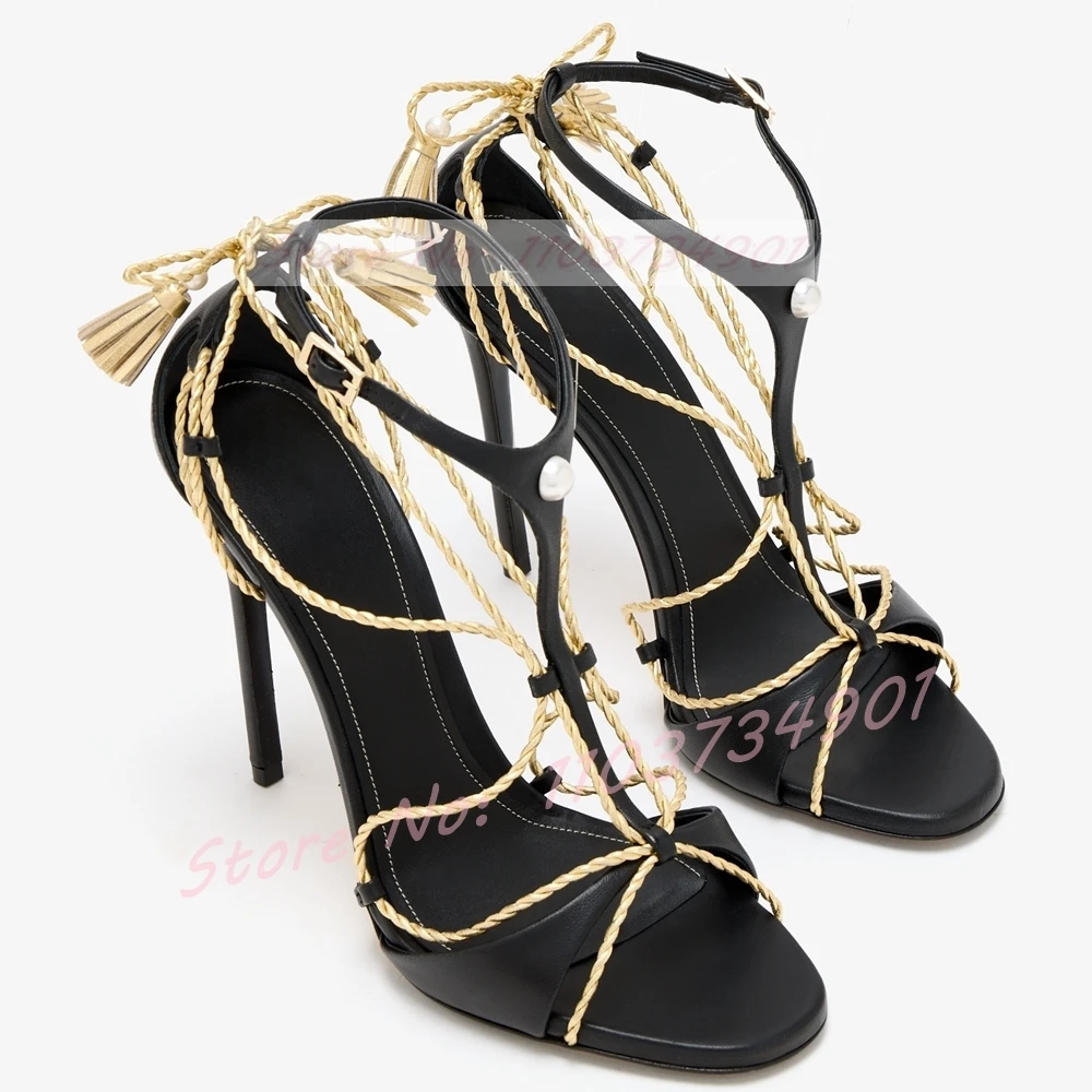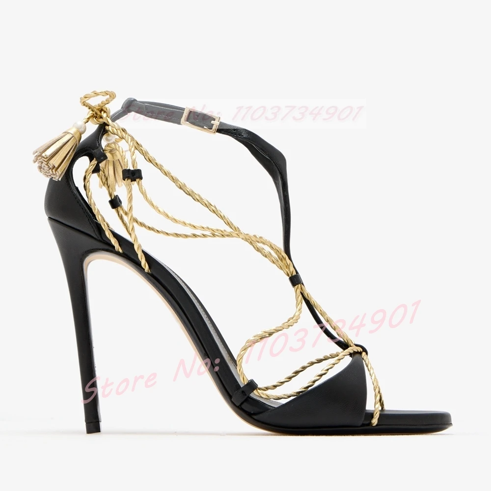 Lace-up Gold Strappy Sandals Women Open Toe Cross Strap Tassels Stiletto High Heels Shoes Female Party Fashion Roman Sandals